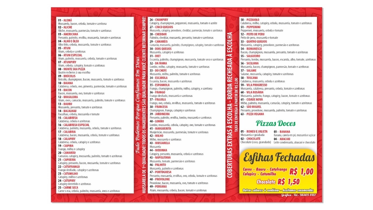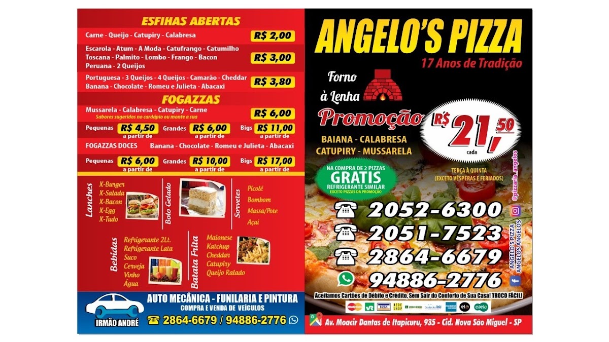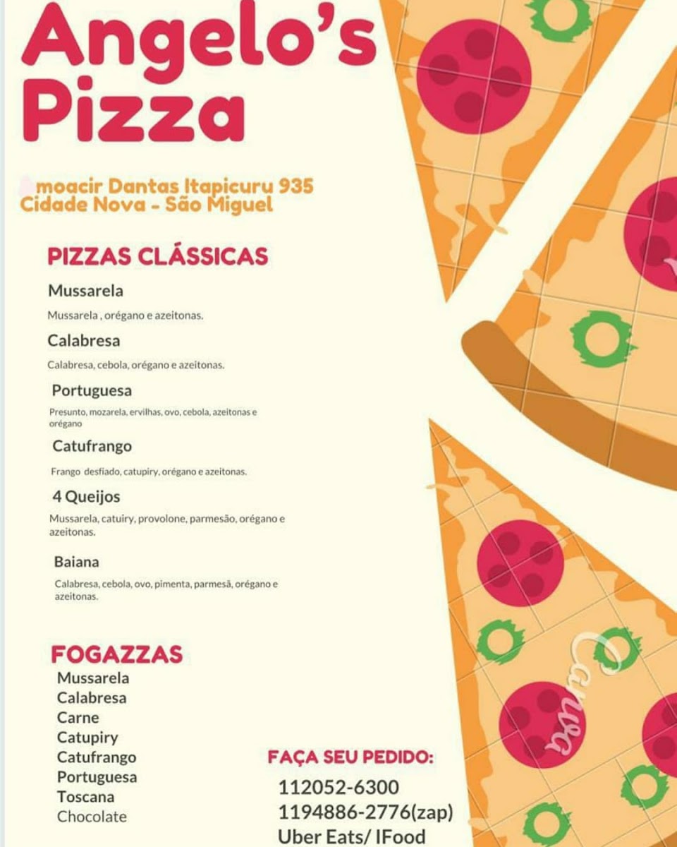 Angelo's Pizza stands out as a gem in São Paulo’s Cidade Nova São Miguel neighborhood, offering an inviting menu centered on authentic, generously topped pizzas. Known for its perfect balance of crispy crusts and rich, flavorful ingredients, Angelo's delights pizza lovers with each bite. The menu extends beyond pizza to include savory fogazza and traditional esfiha, both celebrated for their fresh, hearty fillings and exceptional taste.